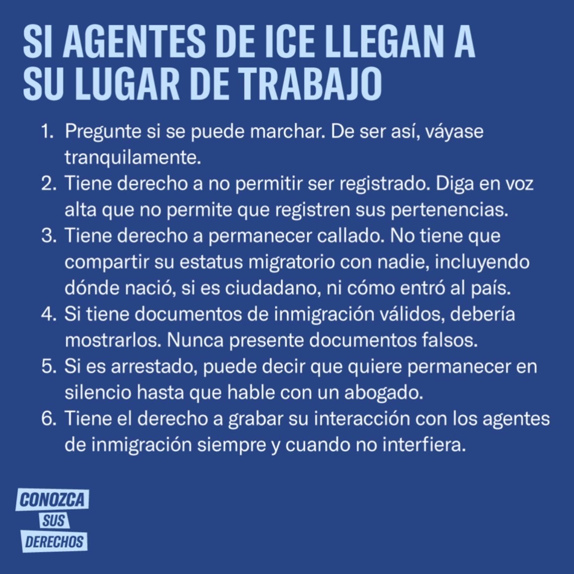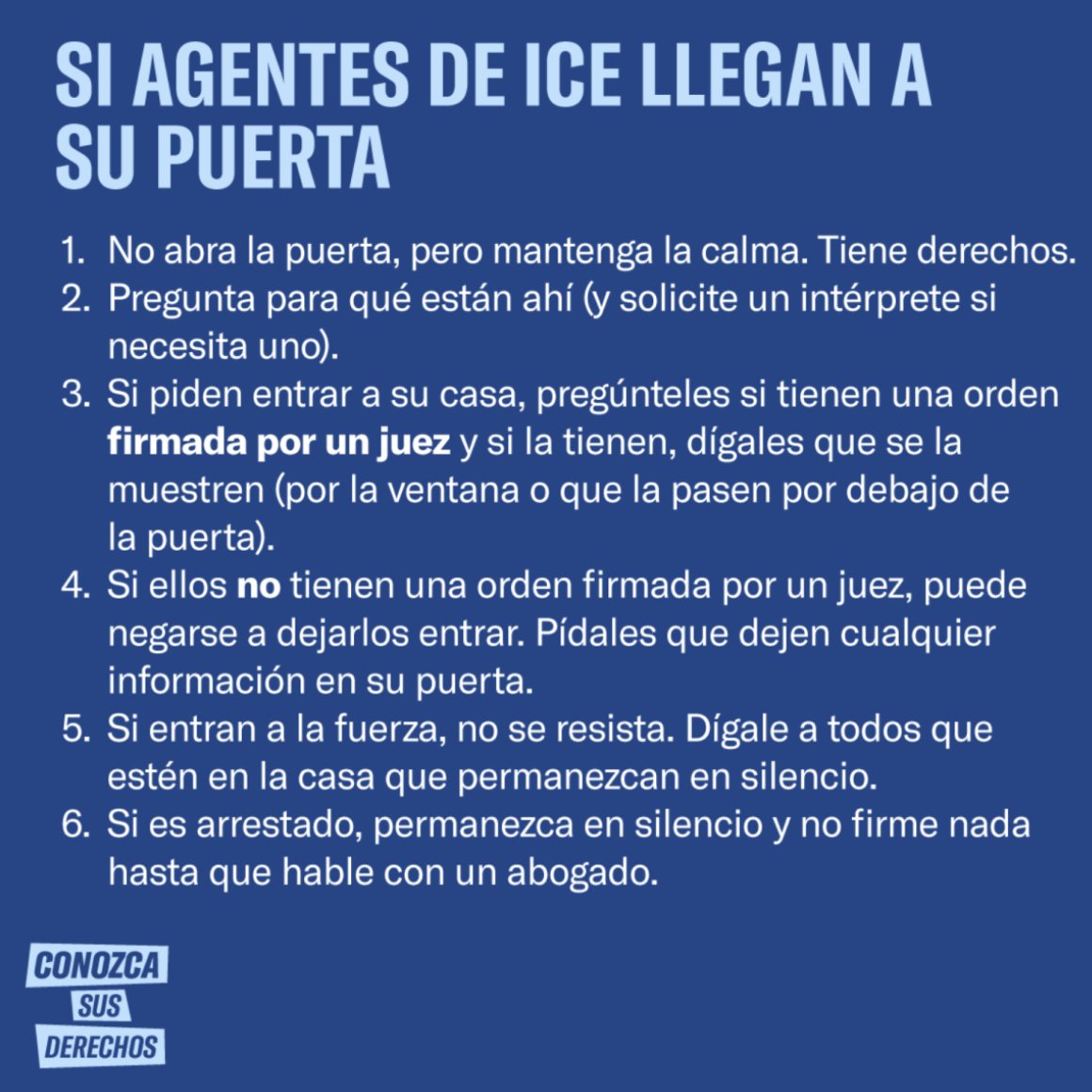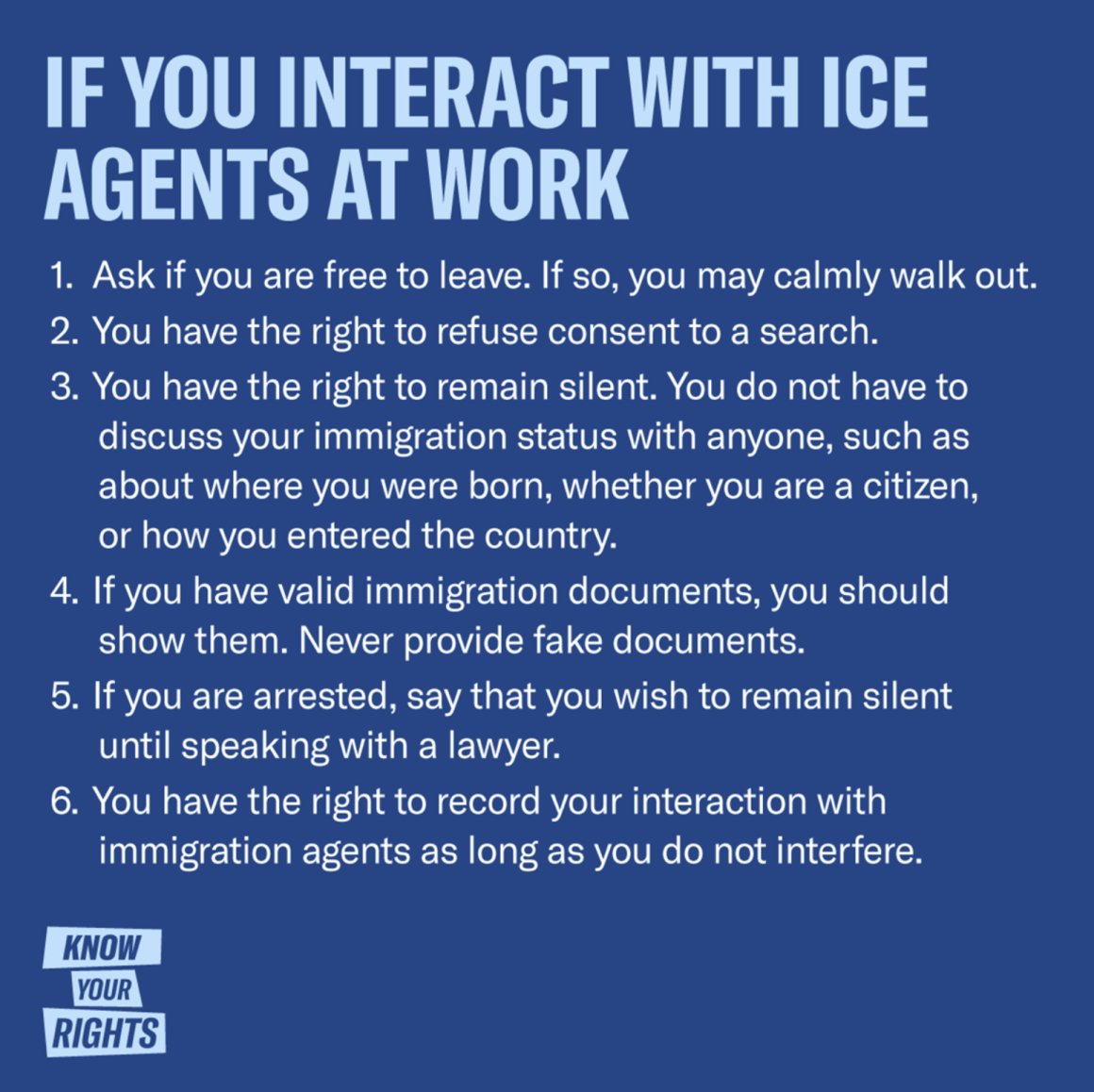 If ICE (Immigration and Customs Enforcement) agents show up at your workplace or home, remember: you have rights. Stay informed, stay calm and stand strong. Share this post and these information cards to help your community know their rights too.